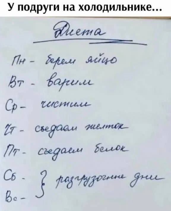 У подруги на холодильнике... Диета Пн - берем яйцо Вт - варим Ср - чистим Чт - сводим желток Пт - съедаем белок Сб - 3 разгрузочные дни Вс - 3 разгрузочные дни
