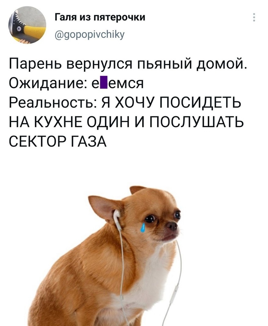Гапя из пятерочки 9ороріусЬіКу Парень вернулся пьяный домой Ожидание еемся Реальность Я ХОЧУ ПОСИДЕТЬ НА КУХНЕ ОДИН И ПОСЛУШАТЬ СЕКТОР ГАЗА