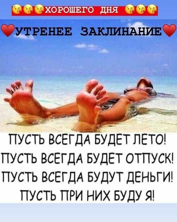 УТРЕНЕЕ ЗАКЛИНАНИЕ ПУСТЬ ВСЕГДА БУДЕТ ЛЕТО ПУСТЬ ВСЕГДА БУДЕТ ОТПУСК ПУСТЬ ВСЕГДА БУДУТ ДЕНЬГИ ПУСТЬ ПРИ НИХ БУДУ Я
