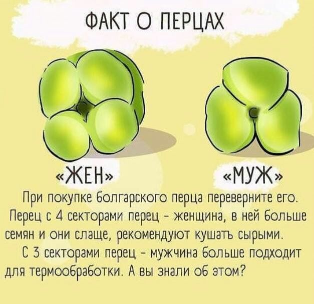 ФАКТ О ПЕРЦАХ При покупке Болгарского перца переверните его Перец с 4 секторами перец женщина в ней Больше семян и они слаще рекомендуют кушать сырыми С 3 секторами перец мужчина Больше подходит для термообработки А вы знали об этом