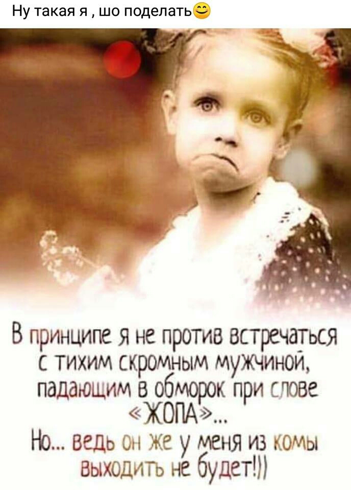Ну такая я шо поделать 5 В принципе я не против встречаться с тихим скромным мужчинои падающим в обморок при слове ЖОПА Но ведь он же уменя из комы выходить не будет