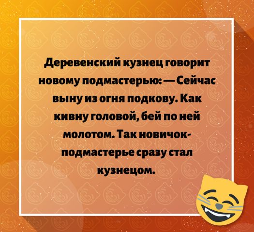 деревенский кузнец говорит иопому подматрьюСейчас пы ну из огня подкову Как кивиу головой бей по ней молотом Так новичок подмаперье сразу стал КУЗИЕЦВМ