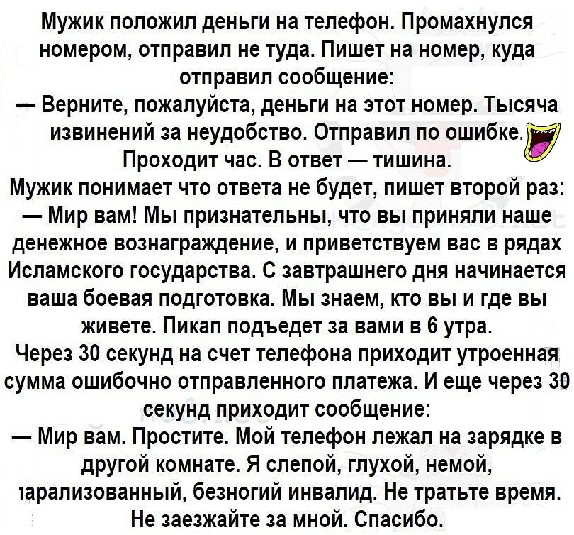 Мужик положил деньги на телефон Промахнулся номером отправил не туда Пишет на номер куда отправил сообщение Верните пожалуйста деньги на этот номер Тысяча извинений за неудобство Отправил по ошибкеЁ Проходит час В ответ тишина Мужик понимает что ответа не будет пишет второй раз Мир вам Мы признательны что вы приняли наше денежное вознаграждение и приветствуем вас в рядах Исламского государства С з