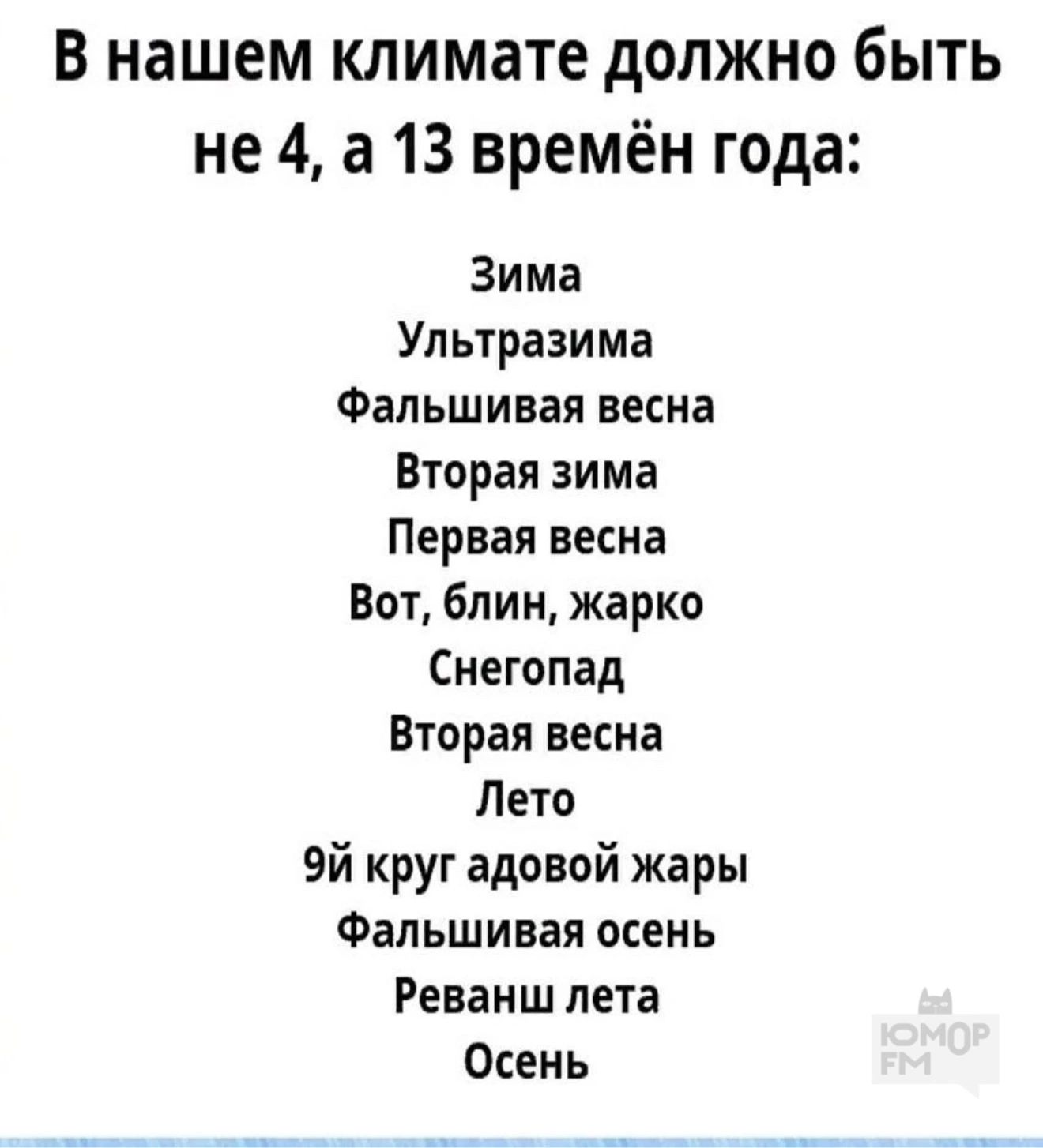 В нашем климате должно быть не 4, а 13 времён года: Зима Ультразима Фальшивая весна Вторая зима Первая весна Вот, блин, жарко Снегопад Вторая весна Лето 9-й круг адовой жары Фальшивая осень Реванш лета Осень