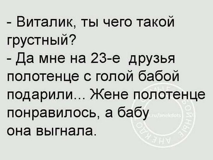 Виталик ты чего такой грустный Да мне на 23 е друзья полотенце с голой бабой подарили Жене полотенце понравилось а бабу она выгнала