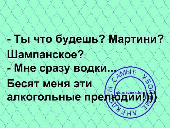 Ты что будешь МарТИНИ Шампанское __ Мне сразу водки Бесят меня эти алкогольные пре