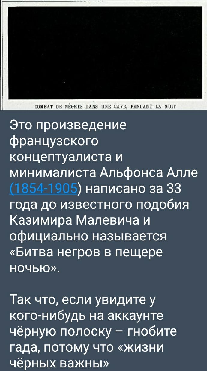 СПХЕП ШЗ ПЁВНБ ПАХЕ ПЕ БАНК ЕПВАПГ Ц ПЩТ Это произведение французского концептуалиста и минималиста Альфонса Алле 1854 1905 написано за 33 года до известного подобия Казимира Малевича и официально называется Битва негров в пещере ночью Так что если увидите у когонибудь на аккаунте чёрную полоску гнобите гада потому что жизни чёрных важны