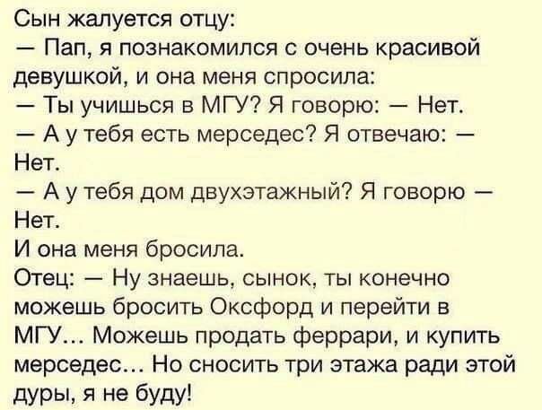 Сын жалуется отцу Пап я познакомился с очень красивой девушкой и она меня спросила Ты учишься в МГУ Я говорю Нет А у тебя есть мерседес Я отвечаю Нет А у тебя дом двухэтажный Я говорю Нет И она меня бросила Отец Ну знаешь сынок ты конечно можешь бросить Оксфорд и перейти в МГУ Можешь продать феррари и купить мерседес Но сносить три этажа ради этой дуры я не буду