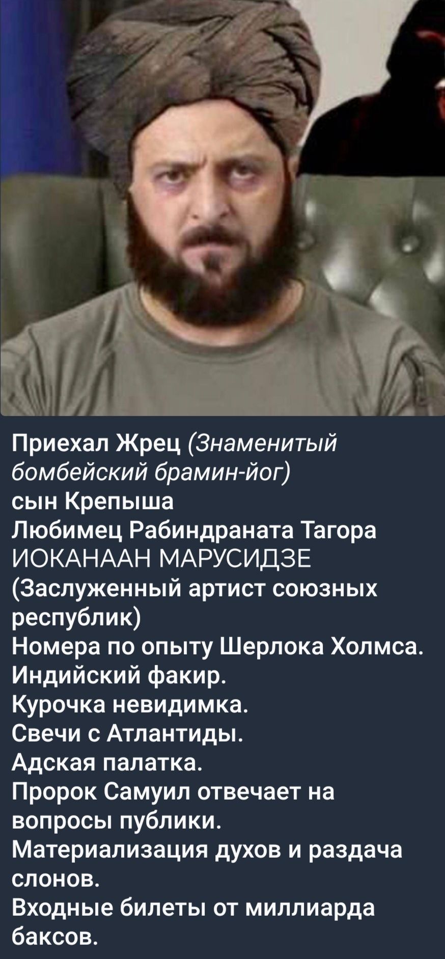 Приехал Жрец Знаменитый бомбейский браминйог сын Крепыша Любимец Рабиндраната Тагора ИОКАНААН МАРУСИДЗЕ Заслуженный артист союзных республик Номера по опыту Шерлока Холмса Индийский факир Курочка невидимка Свечи с Атлантиды Адская палатка Пророк Самуил отвечает на вопросы публики Материализация духов и раздача слонов Входные билеты от миллиарда баксов