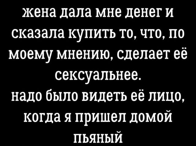 жена дала мне денег и сказала купить то что по моему мнению сделает её сексуальнее надо было видеть её лицо когда я пришел домой пьяный