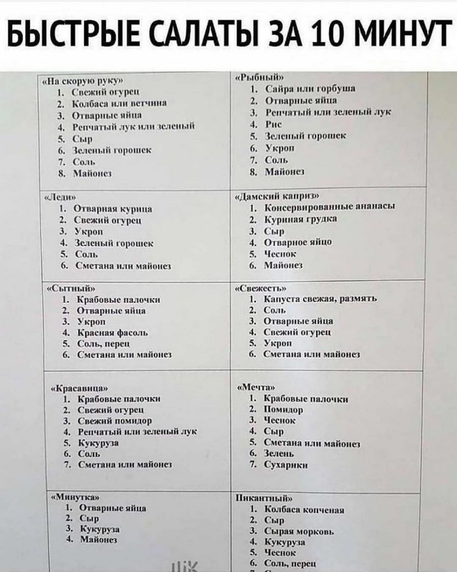 БЫСТРЫЕ САЛАТЫ ЗА 10 МИНУТ Ни скор ю к 3 пшрпып 4 Реп пп цинк тпм п ыспміі пцишпк 7 ч к или міс Опщппш курица исжиппцрец 3 м 4 спыйпцшшск 5 Го и чсгипи іиііопп ттпый Крибоныс пн тачки квпрпысиііпп Укрпп и Крис фасоли 5 мыпсргп 2 Рыбпмі пііри нлп шубу 2 Опшрпмсиііпи питты или шпспьт лук Рис 5 г пыйящтпшк г з 7 тн к Мппткк Димс Мі кипр Кппсщшприияппыс ппппясы 2 Ку яипрупкл а ыр 4 Опишите яйцо 5 іссп