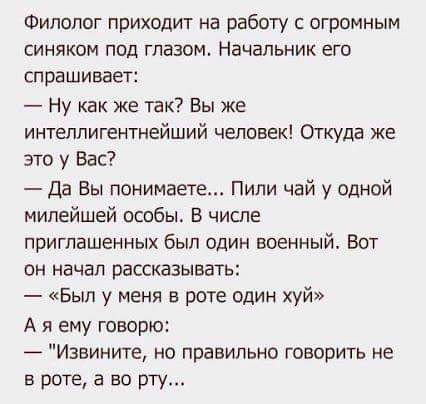 Филолог приходит на работу с огромным синяком под глазом Начальник его спрашивает Ну как же так Вы же интеллигентнейший человек Откуда же это у Вас Да Вы понимаете Пипи чай у одной милейшей особы В числе приглашенных был один военный Вот он начал рассказывать Был у меня в роте один хуй А я ему говорю Извините но правильно говорить не в роте а во рту