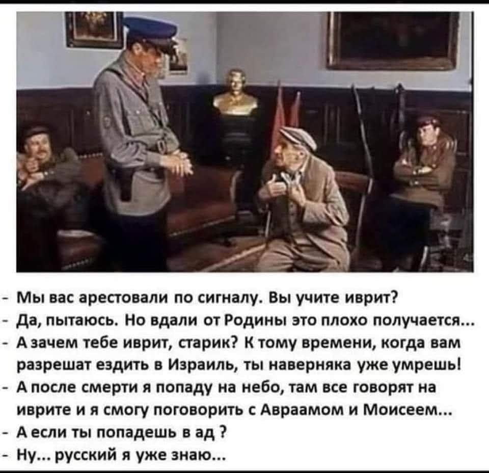Мы вас арестовали по сигналу Вы учите иврит да пытаюсь Но вдали от Родины это плохо получается А зачем тебе иврит старик К тому времени когда вам разрешат ездить в Израиль ты наверняка уже умрешь А после смерти я попаду на небо там все говорят на марте и я смогу поговорить с Авраамом и Моисеем А если ты попадешь в ад Ну русский я уже знаю