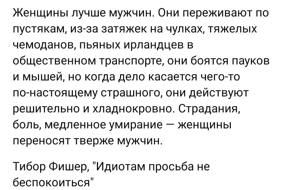 ЖЕНЩИНЫ ЛУЧШЕ МУЖЧИН ОНИ переживают ПО ПУСТПКНМ ИЗЗН ЗЗТЯЖЕК На ЧУПКЭХ ТЯЖеПЫХ чемоданов ПЬЯНЫХ ирландцев Б общественном транспорте они боятся пауков И МЫШЕЙ НО КОГДЗ ДЕЛО КЗСЗЭТСЯ ЧЕГО ТО ПОНЗСТОЯЩЁМУ страшного ОНИ действуют РЕШИТЭПЬНО И ХПНДНОКРОЕНО Страдания боль МЕДПЕННОЕ умирание ЖЕНЩИНЫ переносят тверже мужчин Тибор Фишер Идиотам просьба не беспокоиться