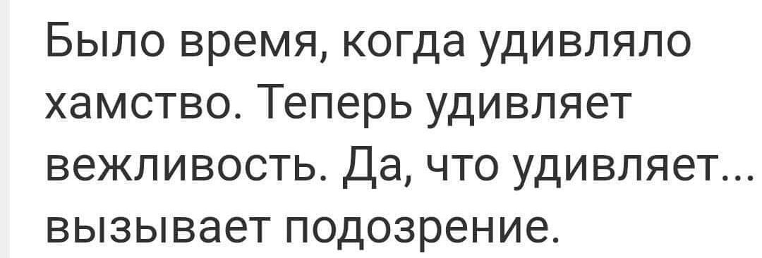 БЫЛО время когда УДИВЛЯПО хамство Теперь удивляет ВеЖЛИВОСТЬ Да ЧТО удивляет вызывает подозрение