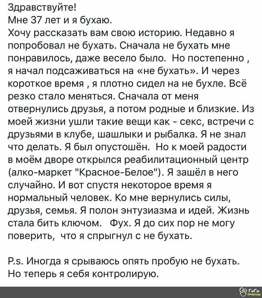 Здравствуйте Мне 37 лет и я бухаю Хочу рассказать вам свою историю Недавно я попробовал не бухать Сначала не бухать мне понравилось даже весело было Но постепенно я начал подсаживаться на не бухать И через короткое время я плотно сидел на не бухле Всё резко стало меняться Сначала от меня отвернулись друзья а потом родные и близкие Из моей жизни ушпи такие вещи как секс встречи с друзьями в клубе ш