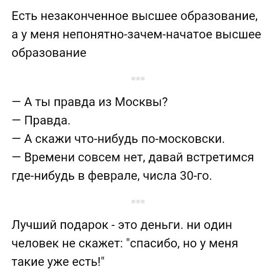 Есть незаконченное высшее образование а у меня непонятноеачем начатое высшее образование А ты правда из Москвы Правда А скажи что нибудь по московски Времени совсем нет давай встретимся где нибудь в феврале числа 30 го Лучший подарок это деньги ни один человек не скажет спасибо но у меня такие уже есть