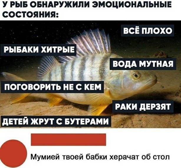 У РЫБ ОБНАРУЖИЛИ ЭМОЦИОНАЛЬНЫЕ СОСТОЯНИЯ всЕ плохо поговорить не с кем БЦ т РАКИ дврзят давить этими Мумией твоей бабки херачат об стоп