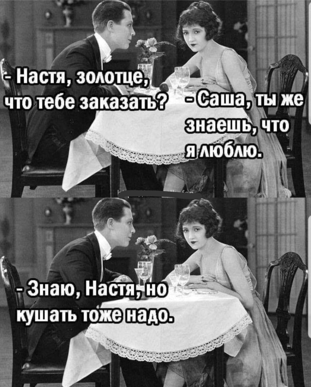 - Настя, золото, что тебе заказать? - Саша, ты же знаешь, что я люблю. - Знаю, Настя, но кушать тоже надо.