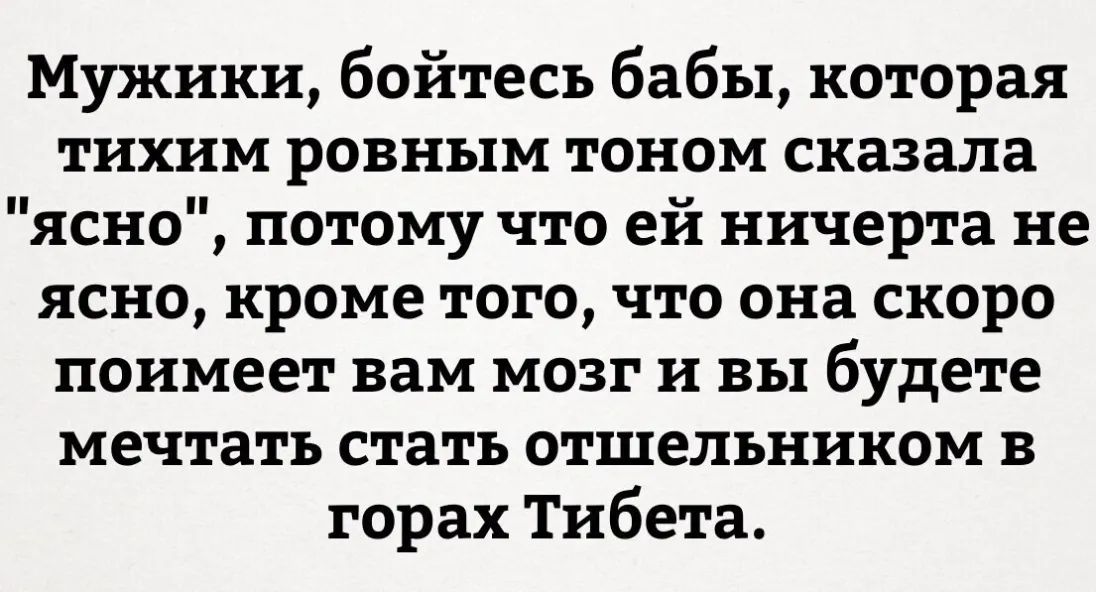 Мужики бойтесь бабы которая тихим ровным тоном сказала ясно потому что ей ничерта не ясно кроме того что она скоро поимеет вам мозг и вы будете мечтать стать отшельником в горах Тибета