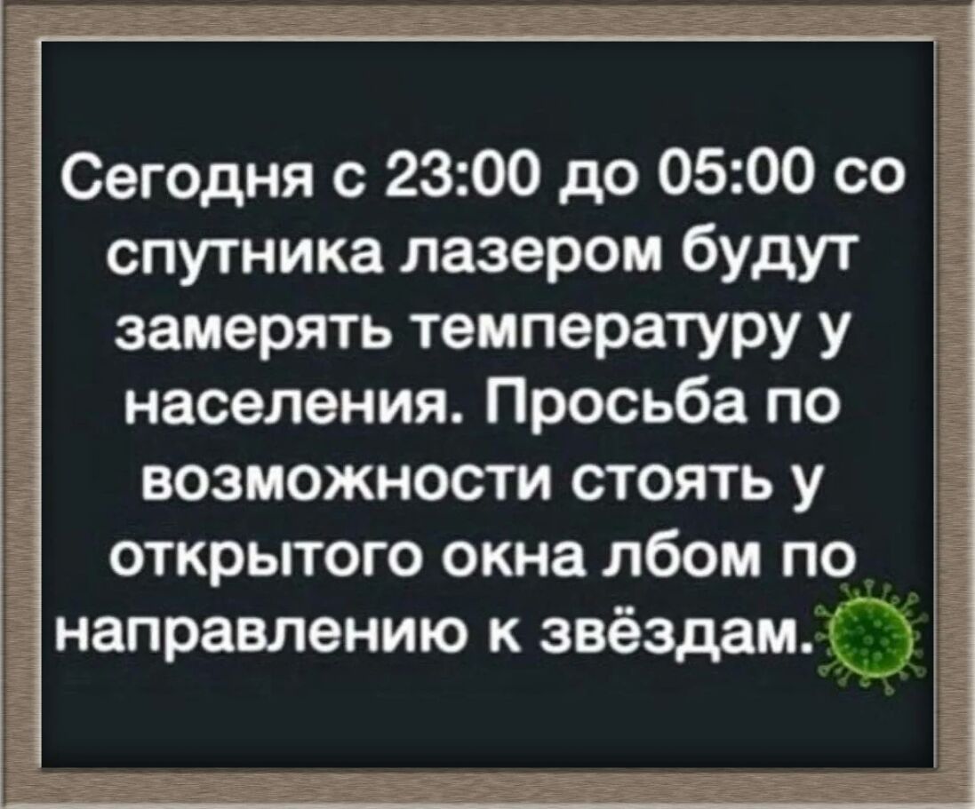 Сегодня с 2300 до 0500 со спутника лазером будут замерять температуру у населения Просьба по возможности стоять у открытого окна лбом по направлению к звёздам