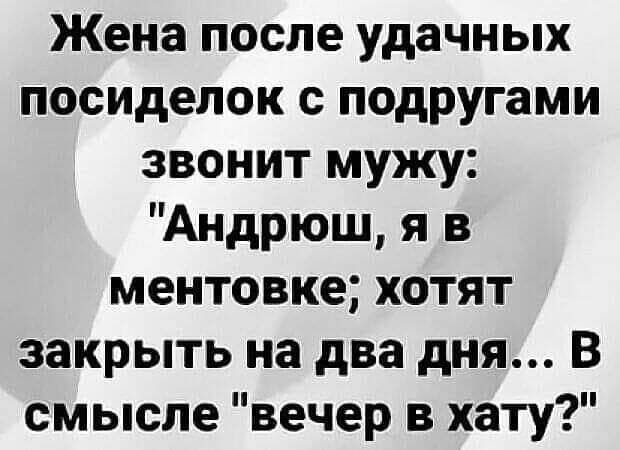 Жена после удачных посиделок с подругами звонит мужу Андрюш я в ментовке хотят закрыть на два дня В смысле вечер в хату