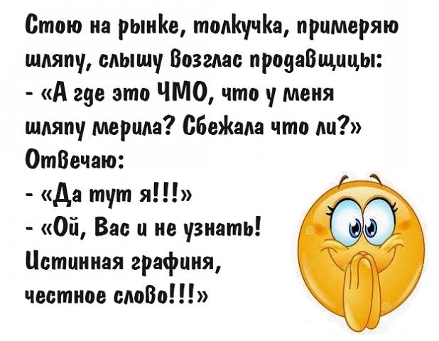 Стою иа рыие тоАКучКа примеряю шляпу слышу Возгдас прояаВщицы А где это ЧМО что у меня шдят мерим сбеЖам что ли ОтВечаю Да тут я Ой Вас н не узнать Истинная графиня честное сдоВоН