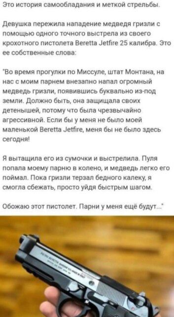 Это история самообладания и меткой стрельбы. Девушка пережила нападение медведя гризли с помощью одного точного выстрела из своего крошечного пистолета Beretta Jetfire 25 калибра. Это ее собственные слова: "Во время прогулки по Миссуле, штат Монтана, на нас с моим парнем внезапно напал огромный медведь гризли, появившись буквально из-под земли. Должно быть, это защищающих своих детёнышей, потому что была чрезвычайно агрессивной. Если бы у меня не было моей маленькой Beretta Jetfire, меня бы не было здесь сегодня! Я вытащила его из сумочки и выстрелила. Пуля попала моему парню в колено, и медведь легко его поймал. Пока гризли терзал бедного калеку, я смогла сбежать, просто у́йдя быстрым шагом. Обожаю этот пистолет. Парни у меня ещё будут..."