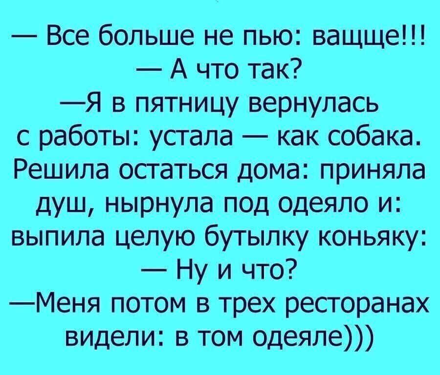 — Все больше не пью: ваще!!! — А что так? — Я в пятницу вернулась с работы: устала — как собака. Решила остаться дома: приняла душ, нырнула под одеяло и: выпила целую бутылку коньяка: — Ну и что? — Меня потом в трех ресторанах видели: в том одеяле)))