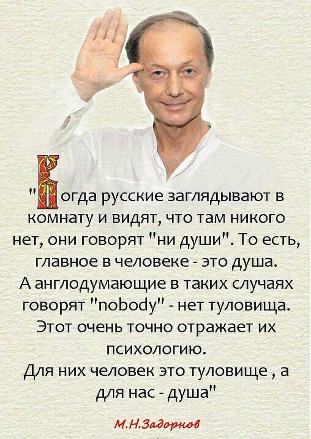 "Когда русские заглядывают в комнату и видят, что там никого нет, они говорят "ни души". То есть, главное в человеке — это душа. А англоязычные в таких случаях говорят "nobody" — нет туловища. Этот очень точно отражает их психологию. Для них человек это туловище, а для нас — душа. М.Н. Задорнов