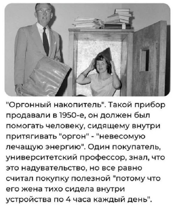 "\"Оргонный накопитель\". Такой прибор продавали в 1950-е, он должен был помогать человеку, сидящему внутри притягивать \"оргон\" — невесомую лечащую энергию. Один покупатель, университетский профессор, знал, что это надувательство, но все равно считал покупку полезной \"потому что его жена тихо сидела внутри устройства по 4 часа каждый день\".