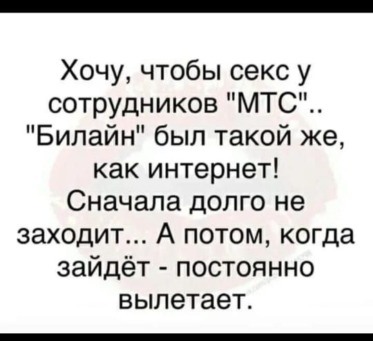 Хочу, чтобы секс у сотрудников "МТС".. "Билайн" был такой же, как интернет! Сначала долго не заходит... А потом, когда зайдёт - постоянно вылетает.
