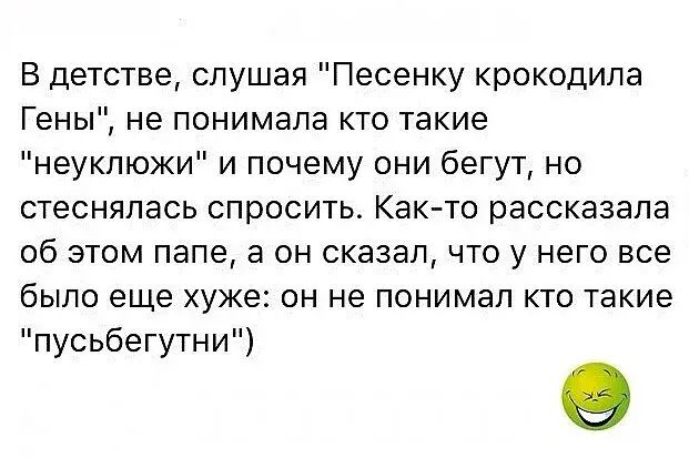 В детстве, слушая "Песенку крокодила Гены", не понимала кто такие "неуклюжки" и почему они бегут, но стеснялась спросить. Как-то рассказала об этом папе, а он сказал, что у него все было еще хуже: он не понимал кто такие "пусьбегутни")